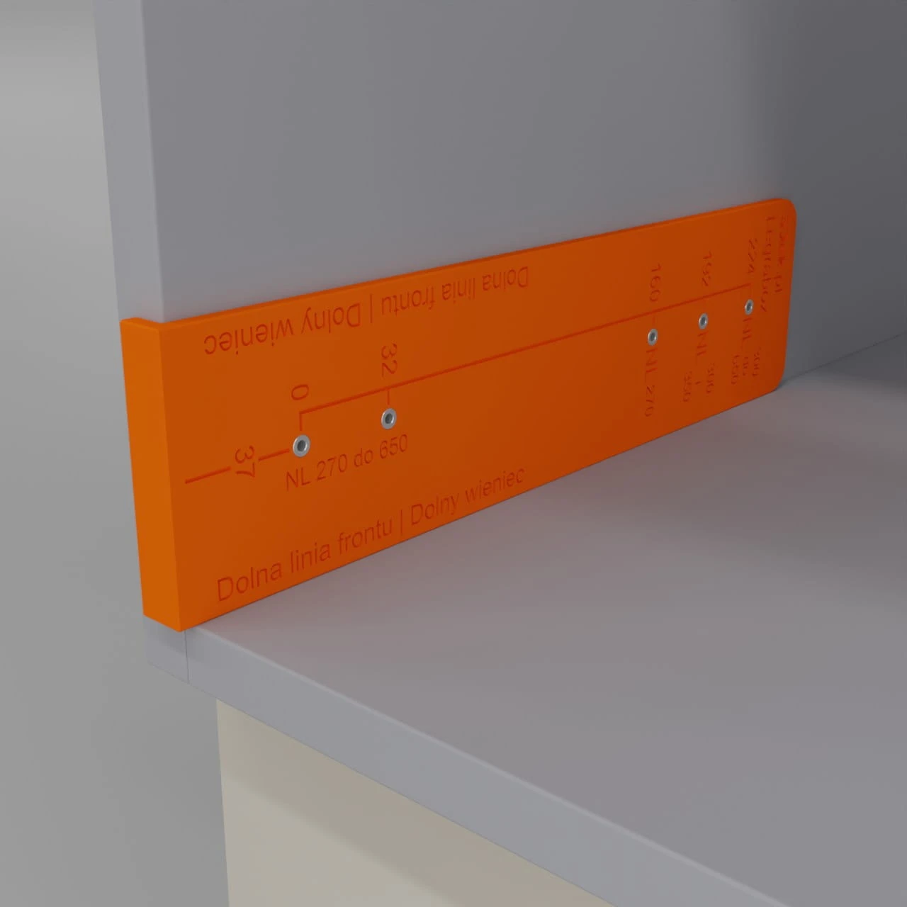 - Przyłóż szablon do dolnego wieńca szafki – pierwsza prowadnica.